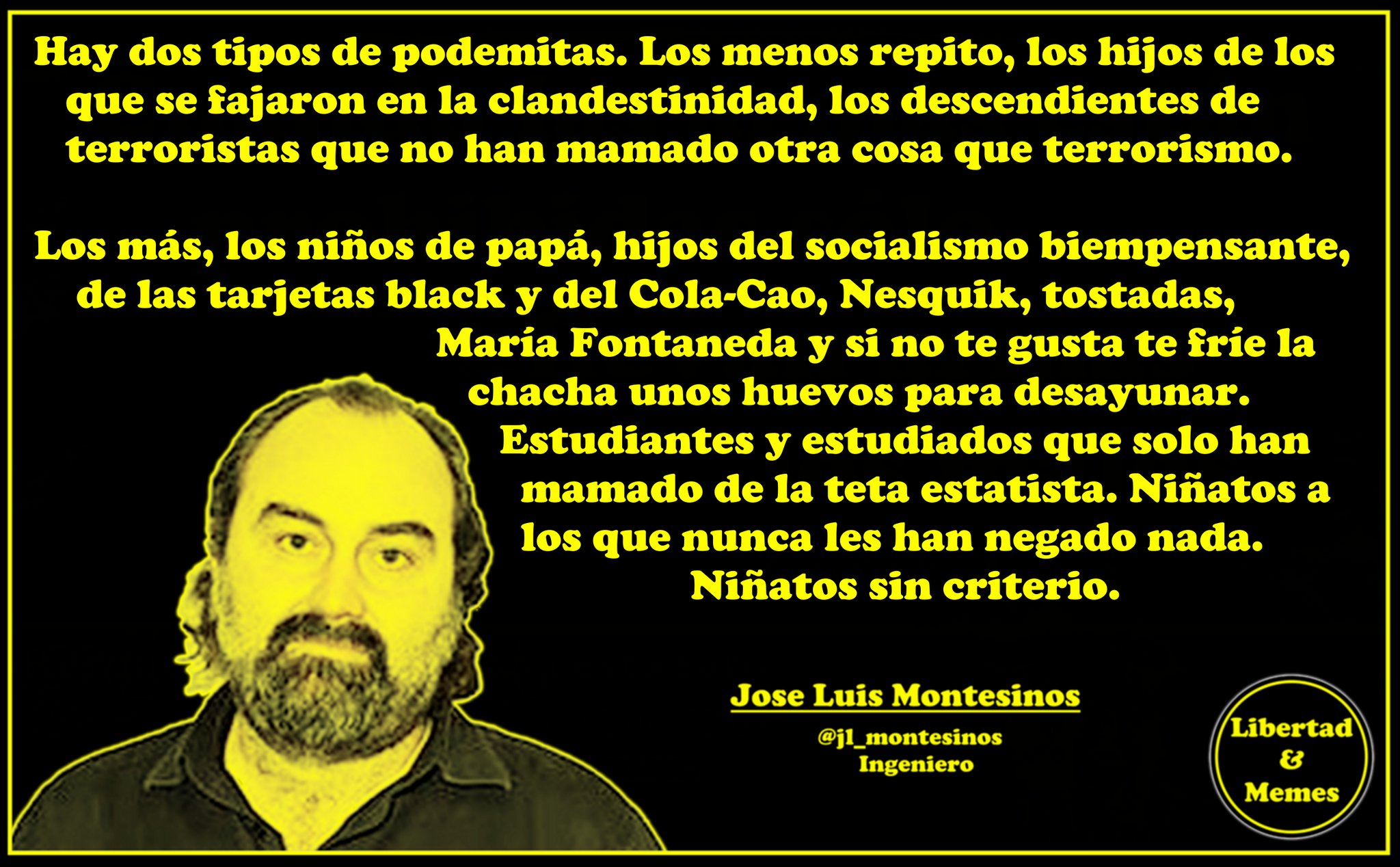 Hay dos tipos de podemitas. Los menos repito, los hijos de los que se fajaron en la clandestinidad, los descendientes de terroristas que no han mamado otra cosa que terrorismo. Los más, los niños de papá, hijos del socialismo biempensante, de las tarjetas black y del Cola-Cao, Nesquik, tostadas, María Fontaneda y si no te gusta te fríe la chacha unos huevos para desayunar. Estudiantes y estudiados que solo han mamado de la teta estatista. Niñatos a los que nunca les han negado nada. Niñatos sin criterio.